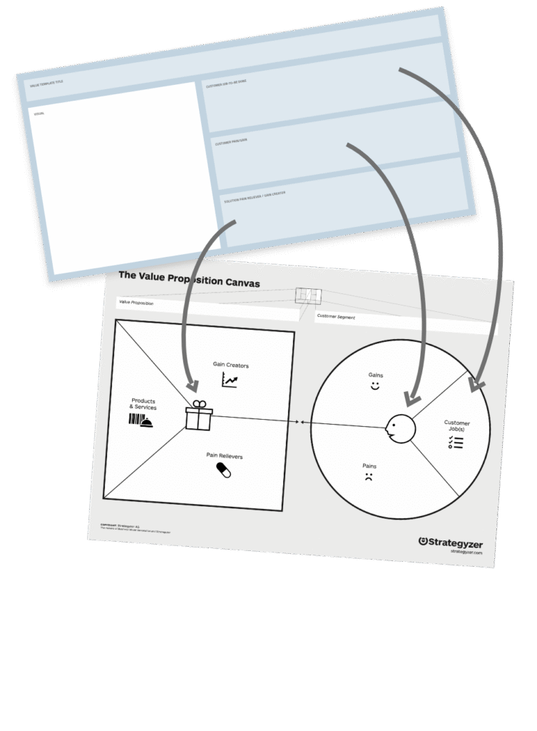 We use the value template cards, to connect customer job-to-be-done and customer pains or gains to graceful solutions and pain reliever or gain creators. This way the ideation if focussed and brings more quality beyond the pure “crazy ideas”.